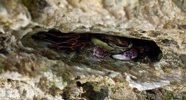 This small crab was hiding in a cave above the ocean waterline, well protected from predators. Surprisingly, the combination of his dark colouring and the white rocks meant the correct exposure was just what the camera’s meter indicated.