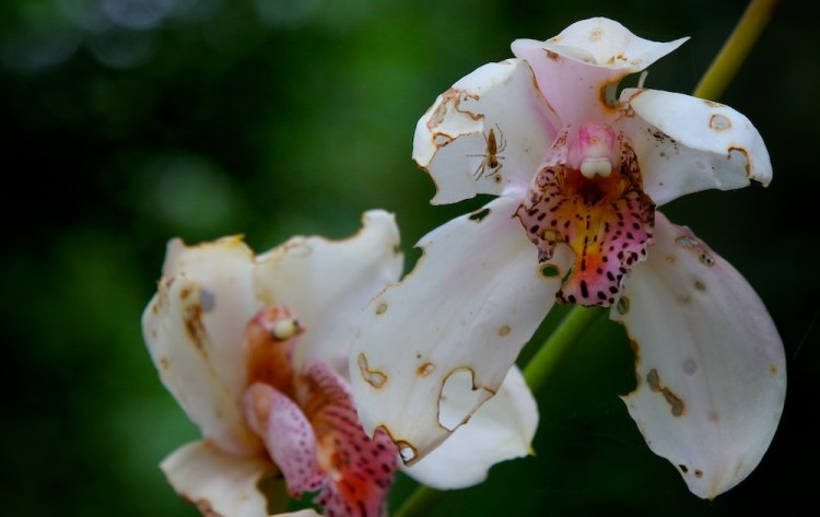 Although the orchid is damaged, the tiny spider on the petal makes this image a keeper.